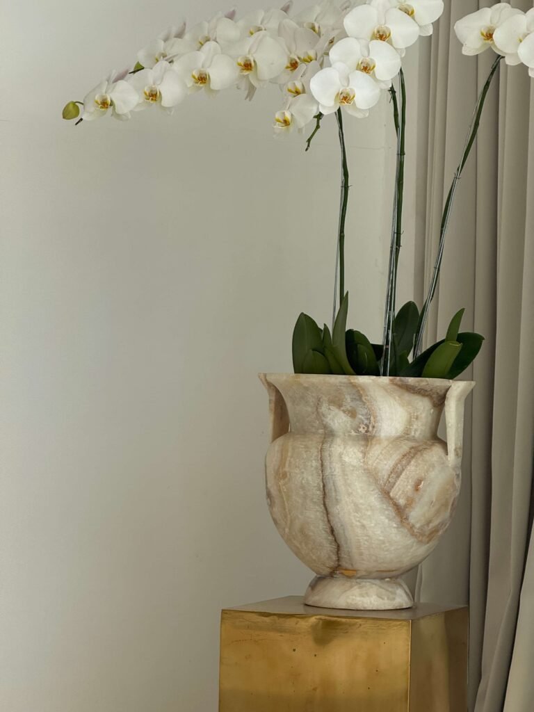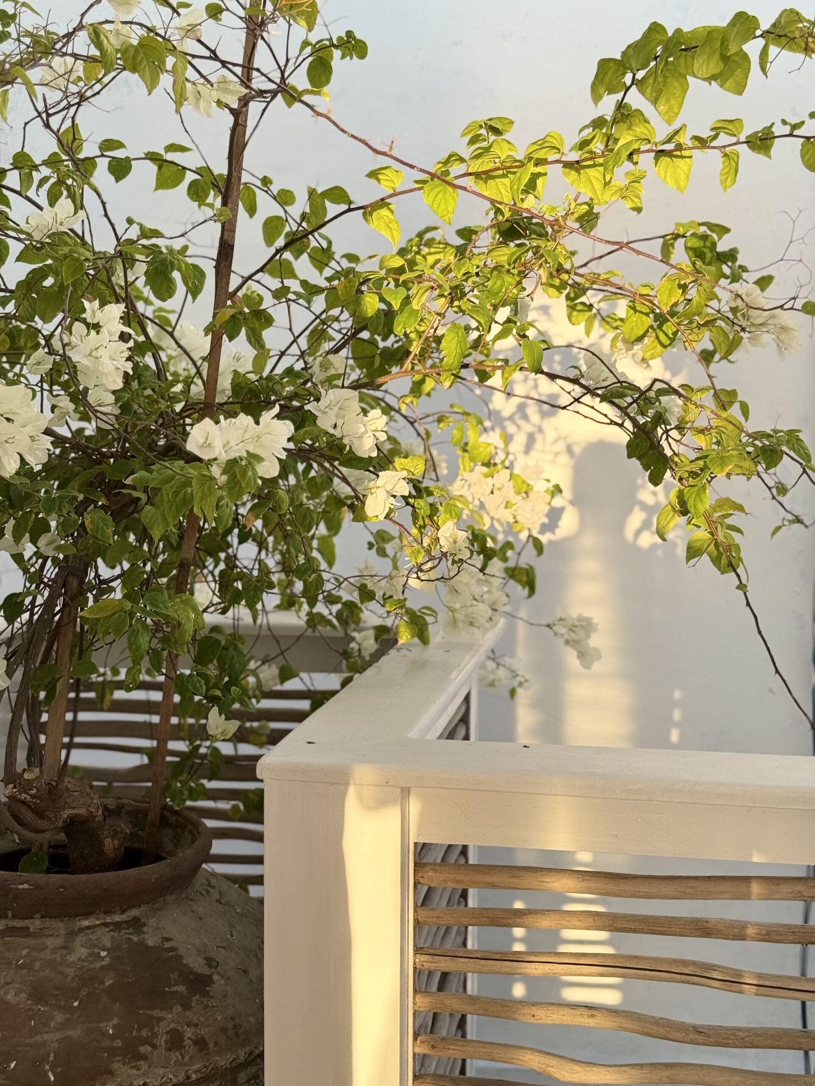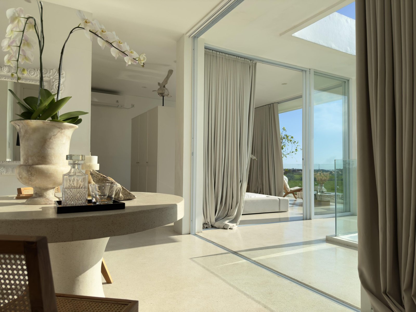 There’s a library, with its own sitting area, a terraced table, an open shower with a view, a bathroom, a foyer, a terrace for drying laundry, and two terraces with their own sitting area and … a walk-in closet.