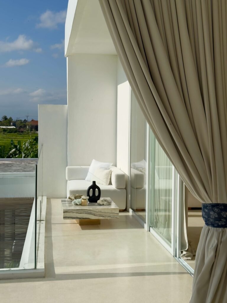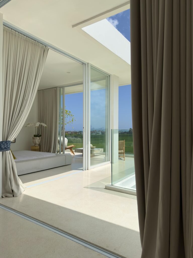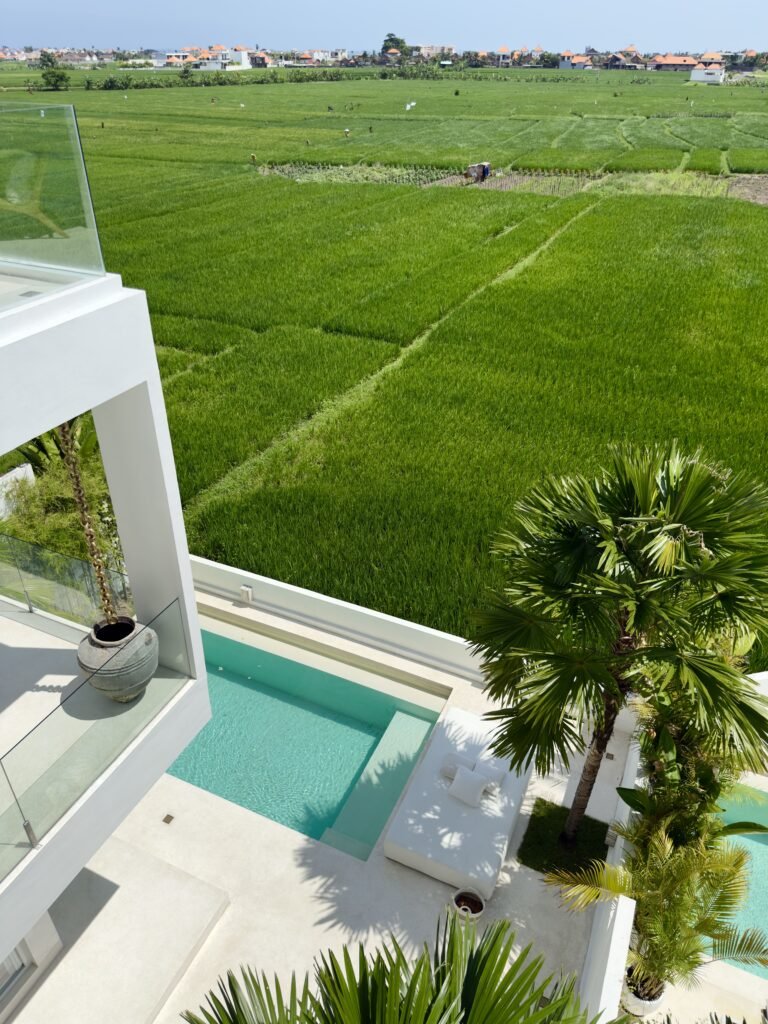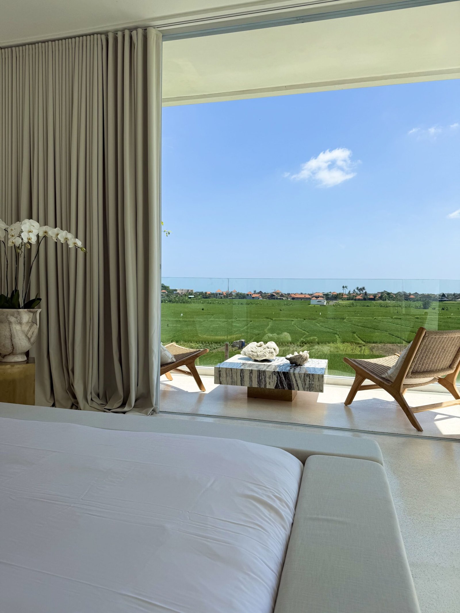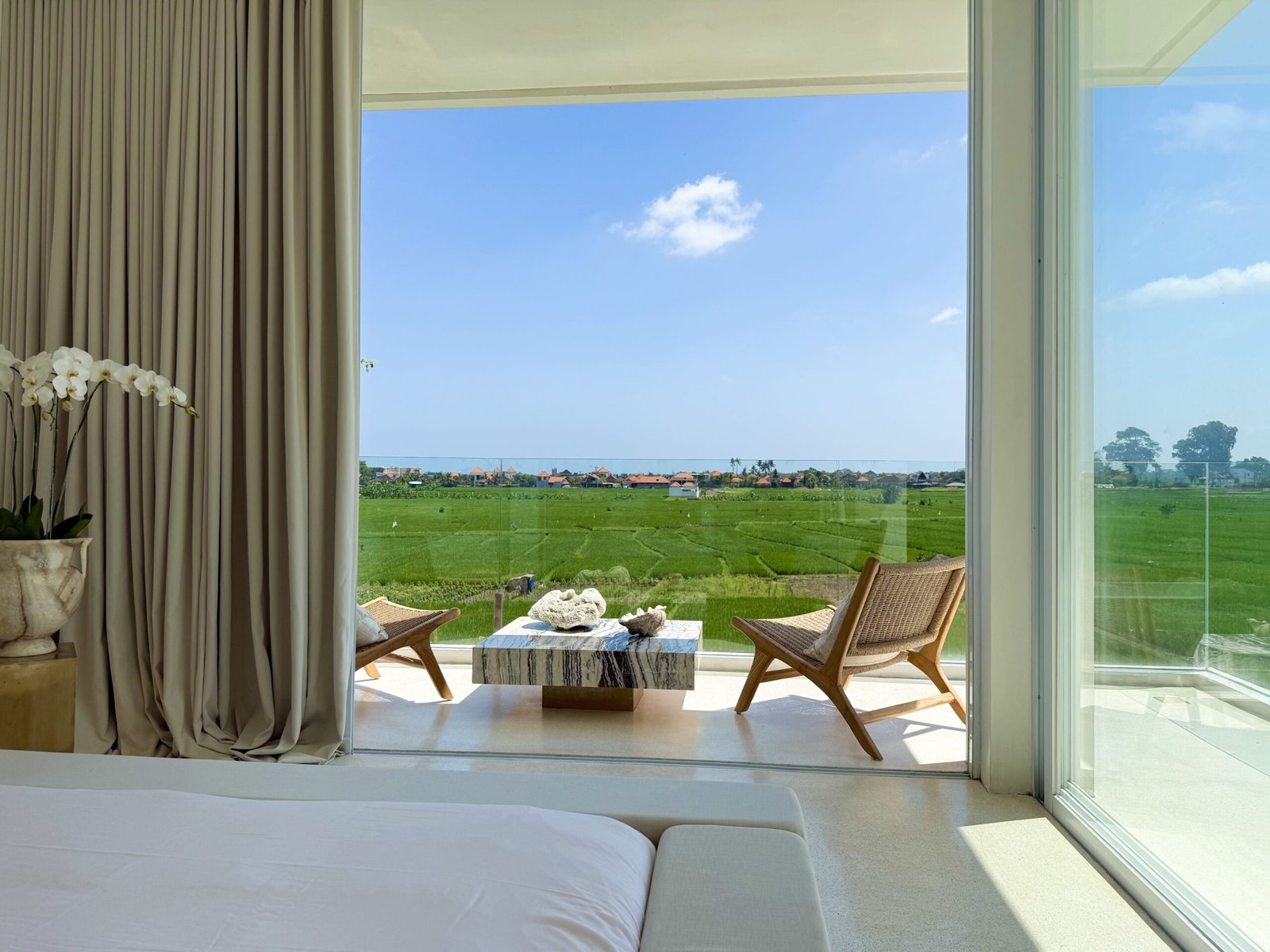 Taking up the entire top floor of the house, this master bedroom is not a bedroom. It’s a penthouse apartment with a sweeping view of rice fields, volcanoes, and ocean from every angle.